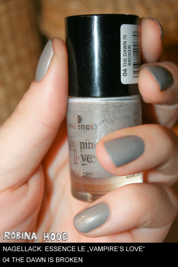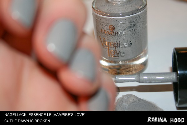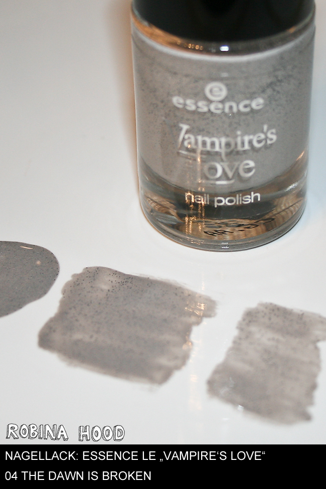 Die Farbe: Nach Dämmerung sieht mir das Ganze eher nicht aus, aber man musste ja die Vampirthemen und Filmtitel irgendwie mit einbeziehen. Für mich ist es ein absolutes Betongrau mit „Strukturputz“. ; ) Die enthaltenen schwarzgrauen und silbernen Glitterpartikel sind in der Tat so grob, dass es irgendwie an Modellbaulacke oder Pasten erinnert, mit denen man sich Miniaturbahnhöfe verzieren kann.