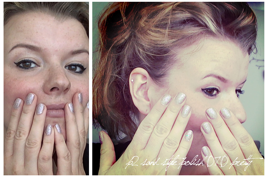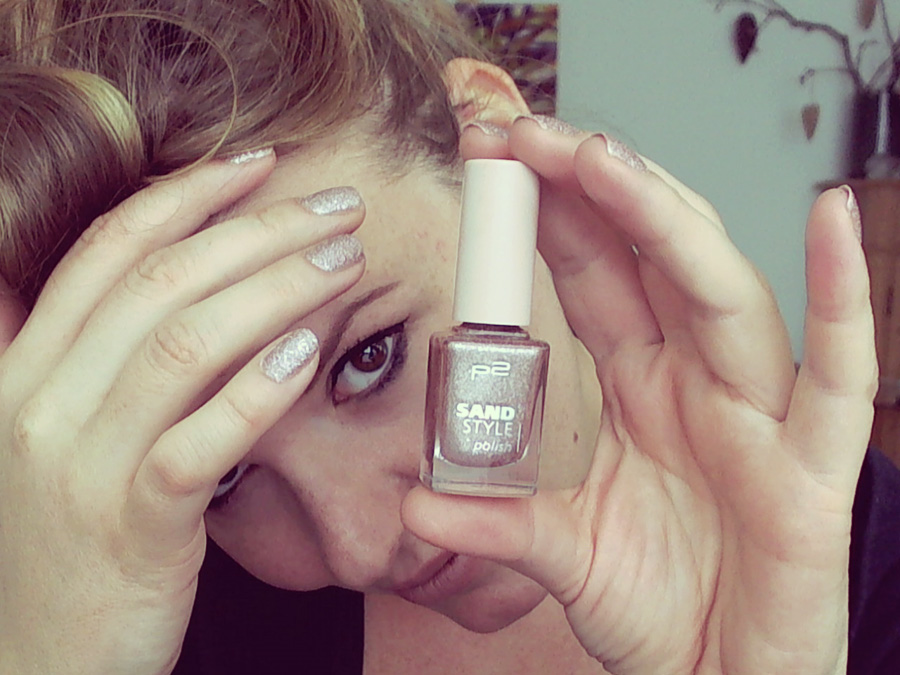 Tadaaa! Es handelt sich um den noch recht frischen (zumindest steht da „neu“ dran) Sand-Style-Nagellack „070 pretty“ von p2 cosmetics. Der Nagellack ist wirklich pretty pretty und passt sehr gut zu Menschen mit rotstichiger Haut (habe ich). Der Grundton des Lacke ist ein fleischiges Altrosa (Ha, was klingt das geil!) mit softem Beigeunterton. Grobe silberne Glitterpartikel schimmern auf dem sandig trocknenden Lack. Der Lack sieht aus, als hätte man Glitzerkiesel auf den Nägeln zerrieben.