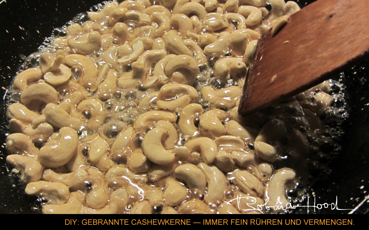 Schritt 3: Dieser Schritt wiederholt sich jetzt eigentlich bis zum Schluss, wenn ihr die Cashewkerne aus der Pfanne holt: Rühren, wenden, rühren, vermengen, rühren. Immer fleißig sein, aber nicht übertreiben. ; )