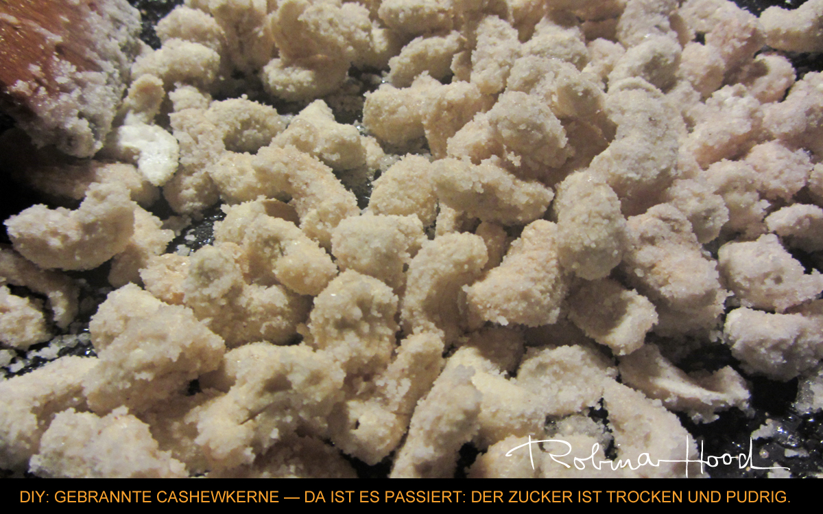 Sobald der Zucker pudrig und trocken ist, geht es in die finale Phase: Die Cashews müssen jetzt weiter gerührt werden, bis sie erneut karamellisieren (d.h. dass sich der Zucker erneut verflüssigt). Aber bloß nicht zuuu flüssig werden lassen. Dann habt ihr einfach nur eine glasige Zuckerkruste, die zudem auch nicht die kompletten Cashews ummantelt, sondern wieder wegläuft oder gar verklumpt. Die pudrigknusprigen Cashews bekommt man ohne viel Übung hin. : )
