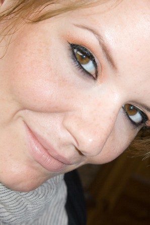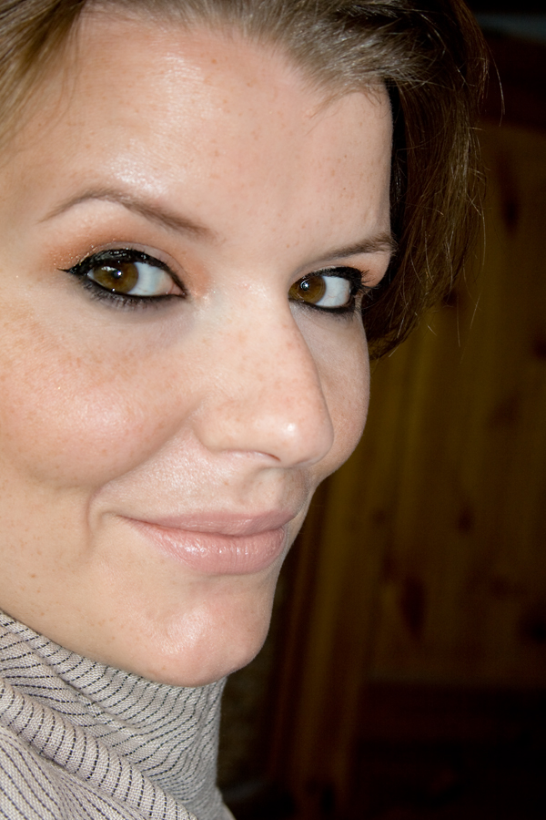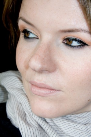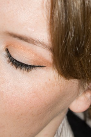 Auf dem Foto mit dem geschlossenen Lid (na ca. 2 Stunden Tragedauer) sieht man deutlich, dass der helle Lidschatten nicht so schön auf dem Lid liegt wie der zimtorange Partner. Die Pigmentierung unterscheidet sich einfach zu stark, als dass die beiden Farben perfekt mitienander gehen könnten. Mir fällt aber auch auf, dass sich ein brauner Lidstrich besser gemacht hätte als mein Standardschwarz (L’Oreàl SUPER LINER Black Vinyl – Ich lieeeebe ihn!). Das Rouge auf den Wangen sieht man kaum. Es eignet sich auch zum Konturieren, insofern man da nicht auf matte Farbe besteht. Der Schimmer ist wirklich akzeptabel dezent.