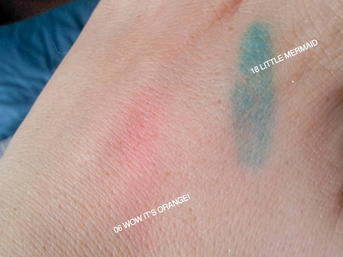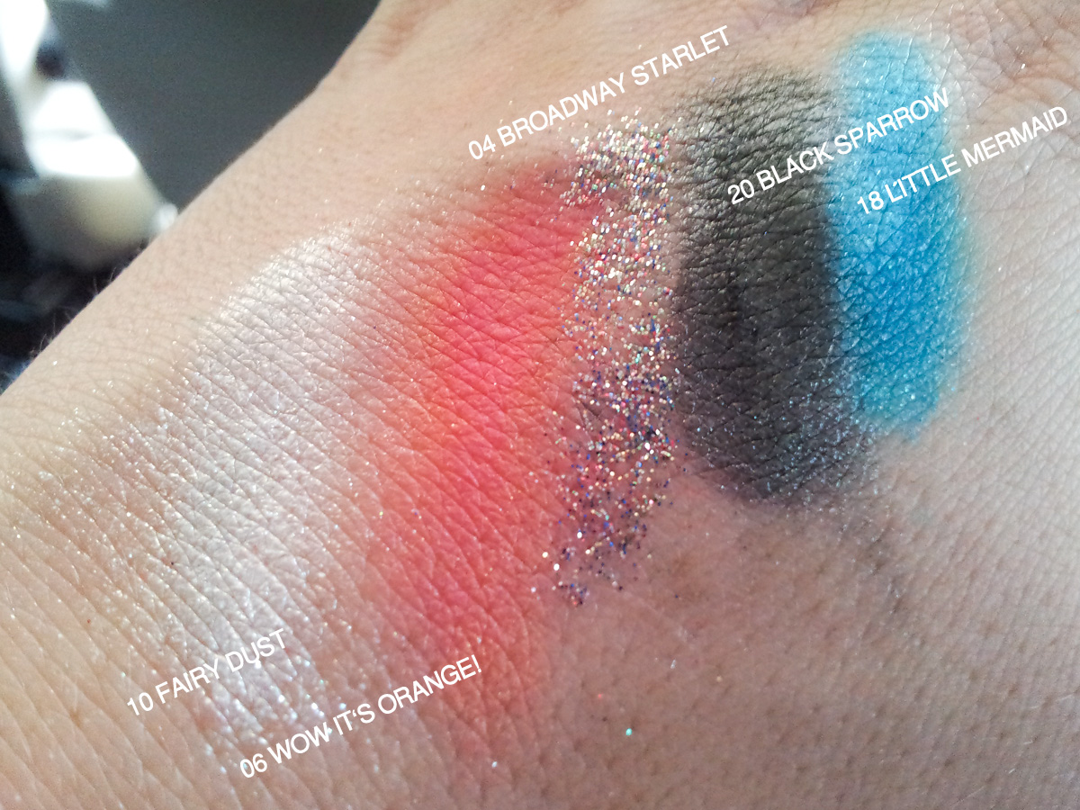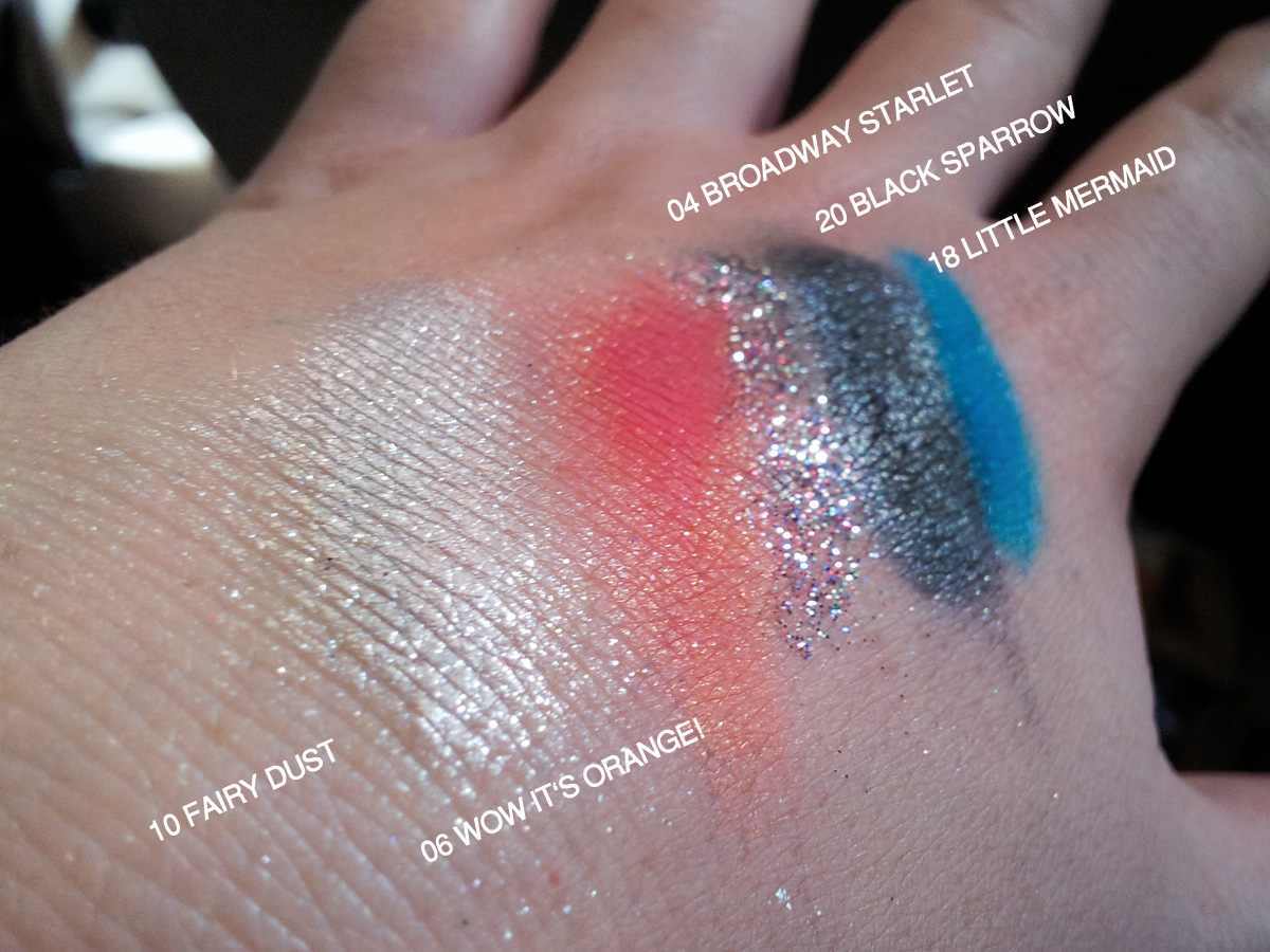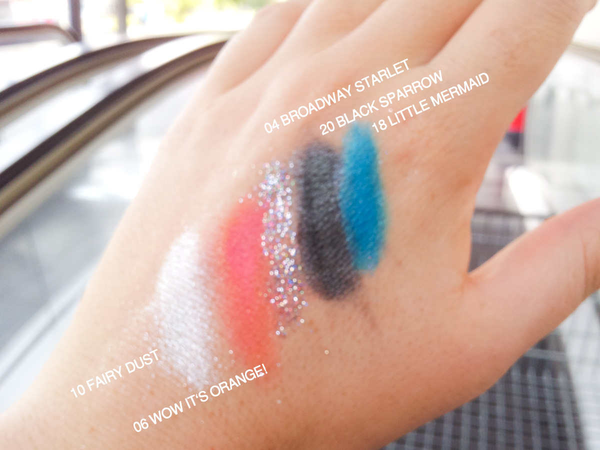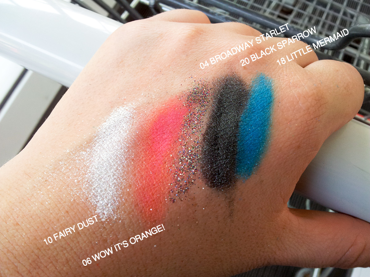 Ein Foto von unterwegs: Swatches der essence-Pigmente 10 fairy dust, 06 wow it‘s orange!, 04 broadway starlet, 20 black sparrow , 18 little mermaid: