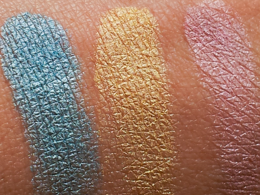 Hier die Lidschatten 010 Bora Bora (blau), 020 South Beach (gelb) und 030 Khao Lak (rosa). Preis je 2,65 €. Alle Farben schimmern sehr stark und sind recht kräftig im Auftrag. Wer derartige Farben noch nicht besitzt, sollte mal genauer hinschauen. Besonders das Gelb ist eher ein Sonnengold, das doch sehr schön anmutet. Ich bin allerdings komplett mit Sleek und Catrice versorgt und benötige keine der Nuancen.