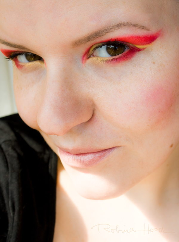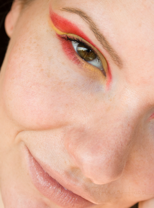 Meine Farben waren Gelb und Rot. Ha, gar nicht so einfach, etwas nach Vorgabe zu zaubern. ; ) Rausgekommen ist ein Blütenblatthöllen-AMU (AMU = Augen-Make-up), das nicht gerade alltagstauglich ist. Aber, pfeifen wir doch drauf, oder? ;)