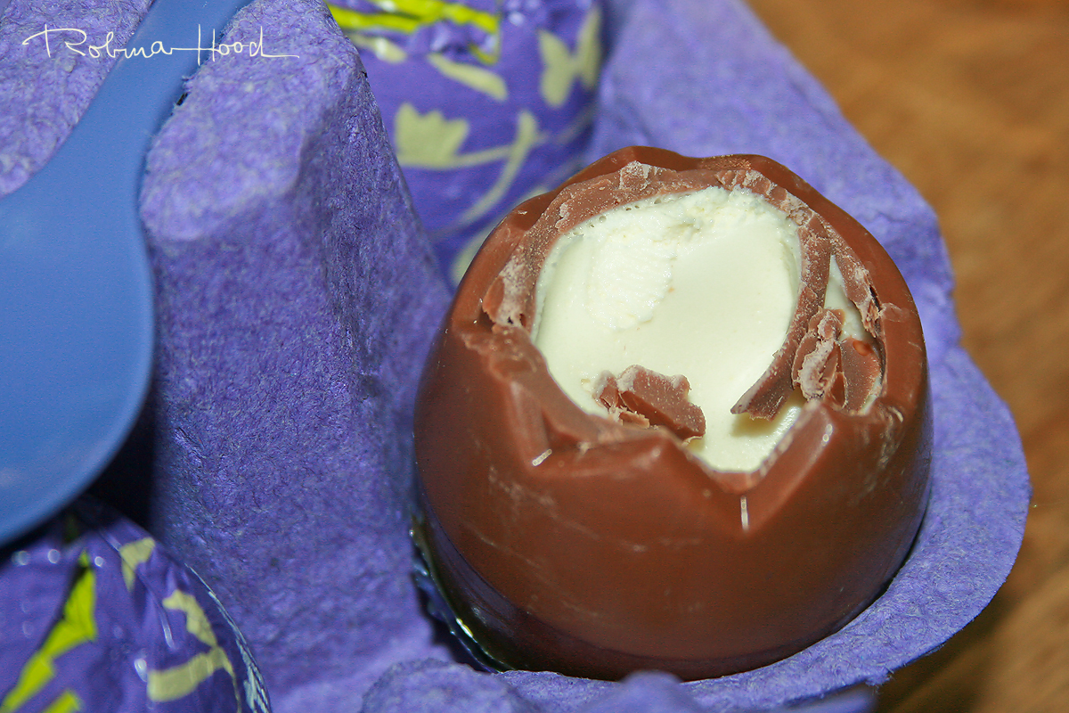 Angeknabbert sieht das gefüllte Schokoei besser aus. Zum Vorschein kommt eine weiß-gelbliche Milchcreme (sieht hier vielleicht ein bisschen grünstichig aus, wie ich grad feststelle).