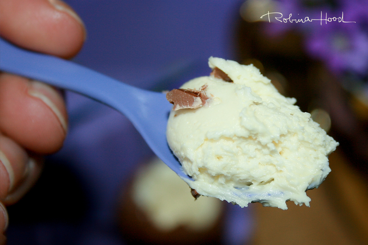 Die Créme ist fluffig aufgeschlagen, aber für meinen Geschmack zu leicht. Ich mag eine eher festere Konsistenz. Wenn meine Hüften schon mit Kalorien beschossen werden, dann möchte ich sie auch schmecken. So bekomme ich bestenfalls eine luftig-süß-schmierige Portion Milchcreme samt normaler Alpenmilchschokolade ins Schleckermäulchen geschoben.