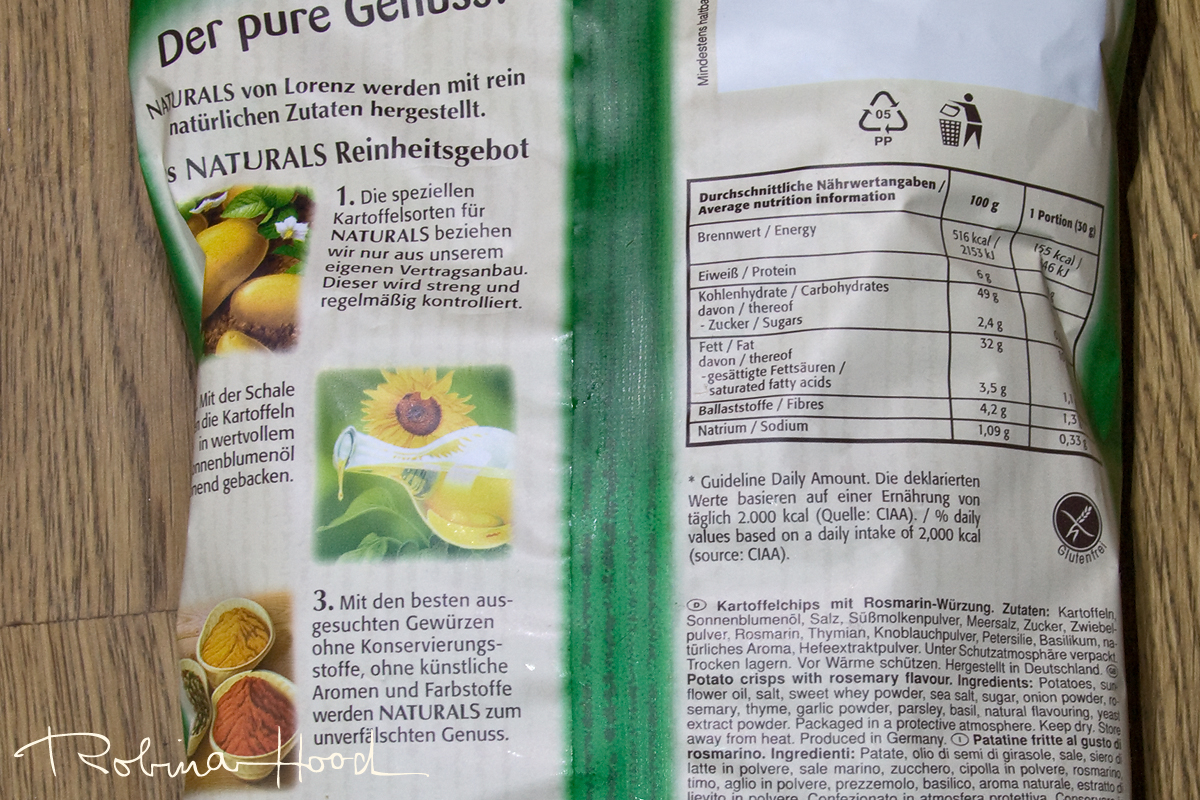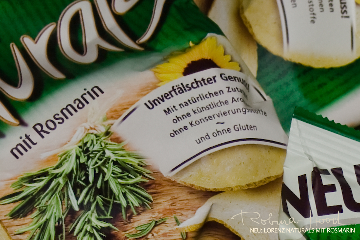 Wie heißt es auf der Rückseite nun genauer? Statt der verlockenden Kurzfassung „Naturals mit Rosmarin“ auf der Frontseite kann man nun lesen (und gleich auch näher auseinandernehmen) „Kartoffelchips mit Rosmarin-Würzung„
