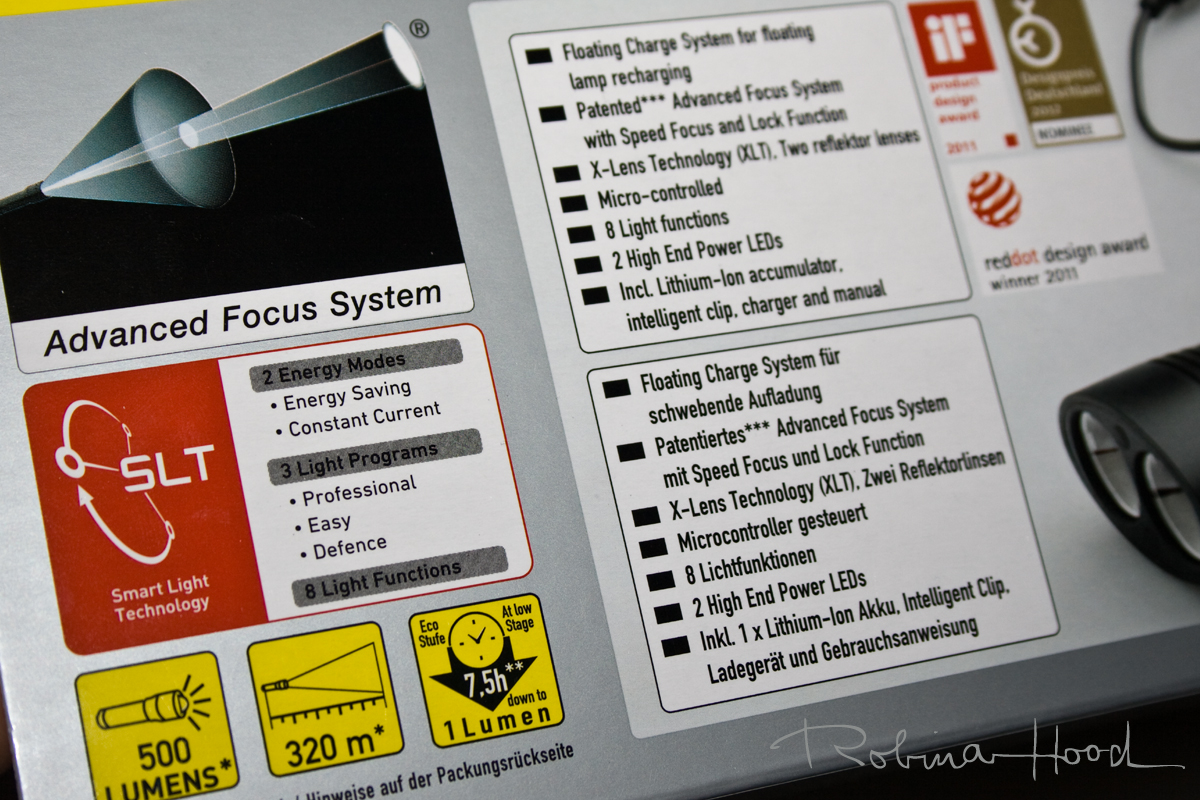 Neben 8 möglichen Lichtfunktionen — morsen, Boost-Modus, Power-Modus, Low Power-Modus, gedimmter Modus (stufenlos regelbar bei leicht angedrücktem Knopf), Blink-Modus, SOS-Modus und Abwehr-Strobo-Lichtblitze, die wirklich jeden in die Flucht schlagen, der in die Lampe schaut — verfügt die Lampe über das patentierte Advanced Focus System. Dabei greift man am besten mit der einen Hand den Schaft der Lampe und schiebt mit der anderen den Objektivtubus (der vordere Teil der Lampe, der die LEDs beinhaltet) vor, um den Lichtstrom suchscheinwerferartig zu bündeln oder zurück, um den Nahbereich bis 45 Meter gleichmäßig und kreisrund auszuleuchten. Es ist beeindruckend, wie HELL die Umgebung ausgeleuchtet wird. Beim punktfokussierten Bündellicht sind selbst in weiter Ferne liegende Objekte in schwärzester Nacht auszumachen.