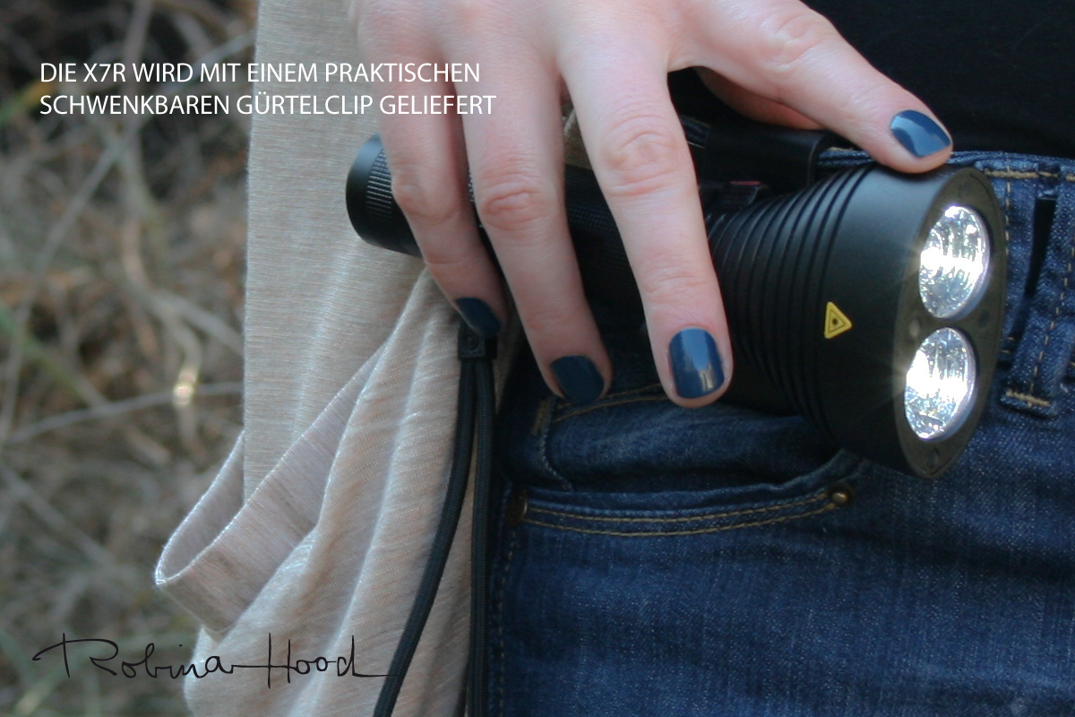 Der mitgelieferte Gürtelclip, der sehr robust und fest verarbeitet ist, passt auf alle Gürtel bis 6 cm Breite und lässt sich schwer wieder lösen, hält also bestens auch bei starken Bewegungen. Der Clip ist in alle Richtungen drehbar und rastet in verschiedenen Stellungen sicher ein. So sind der Sitz und der Halt der Taschenlampe garantiert und man hat beide Hände frei.