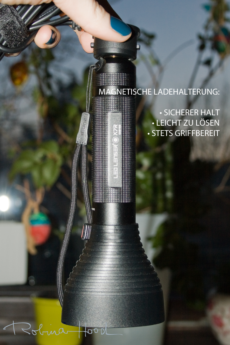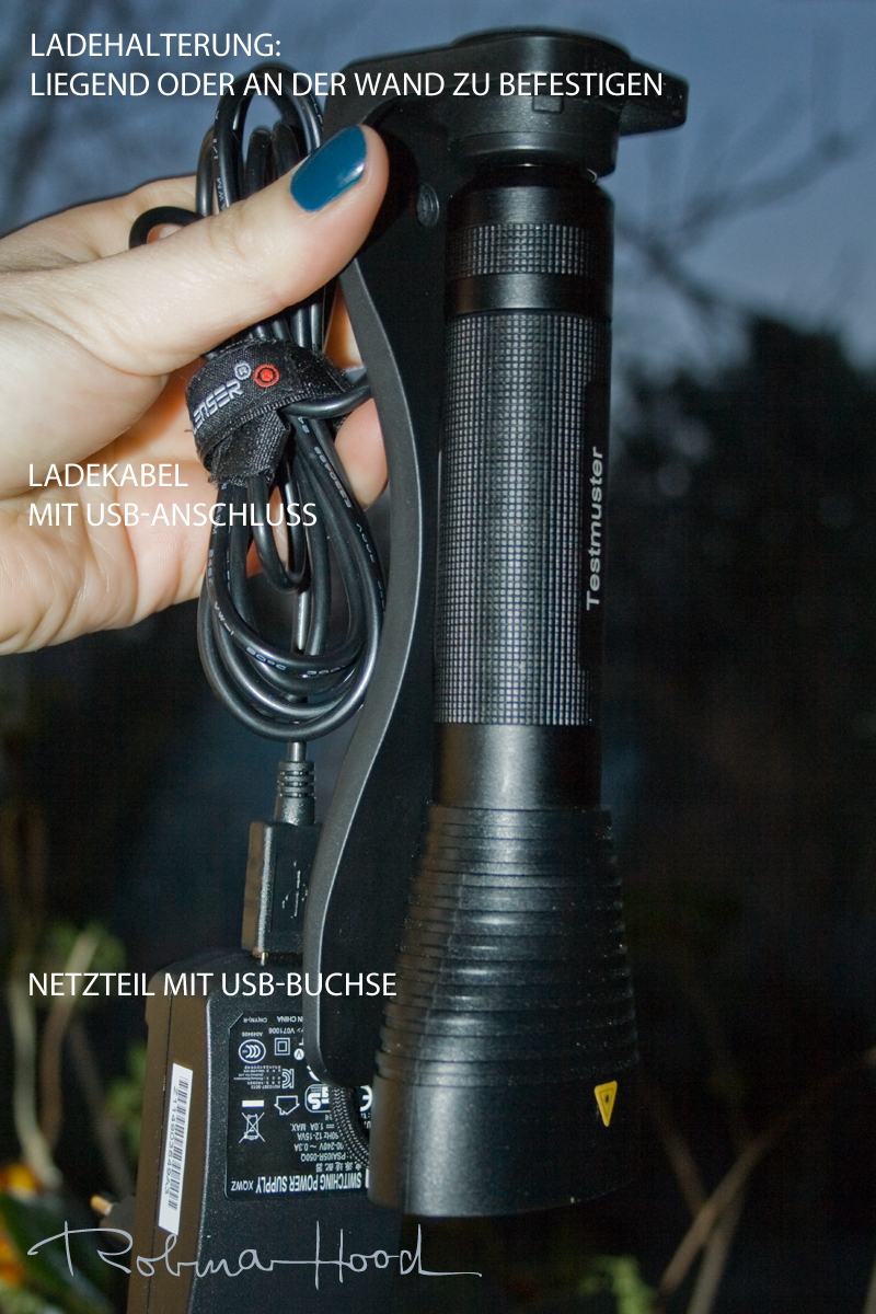 Zusätzlich zu Ladekabel und Netzstecker mit USB-Buchse erhält man eine Art Ladestation bzw. Ladeschiene, in die man die Lampe legen kann oder aber hängend an der Wand befestigen. Wer der passenden Platz dafür gefunden haben sollte, könnte die Taschenlampe stets griffbereit in seiner Nähe haben. Bei mir liegt die Lampe auf dem Schreibtisch in USB-Buchsennähe. ; ) Beide Varianten sehen ästhetisch aus und sind nützlich. Besonders vorteilhaft ist, dass es keine Kabel gibt, die störanfällig wären sowie keine Batterieabfälle, da der Lithium-Ionen-Akku umweltfreundliches Aufladen garantiert.