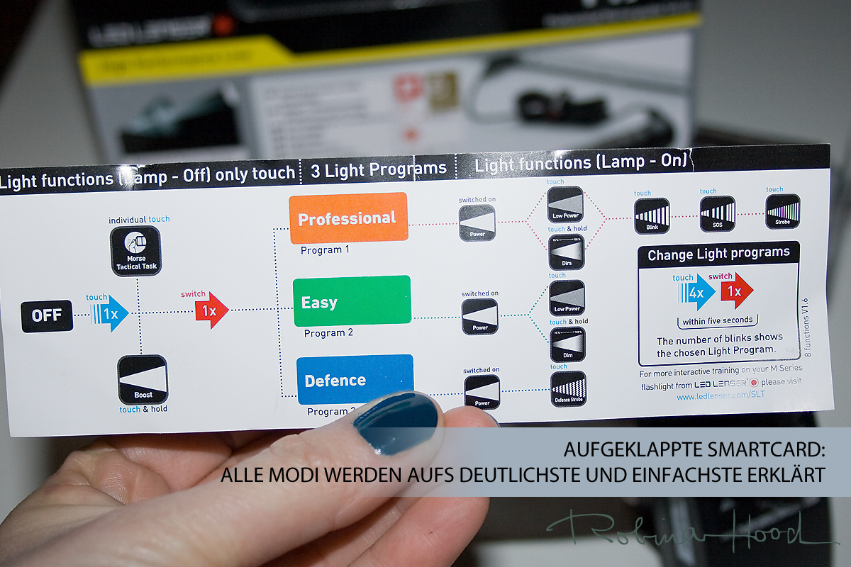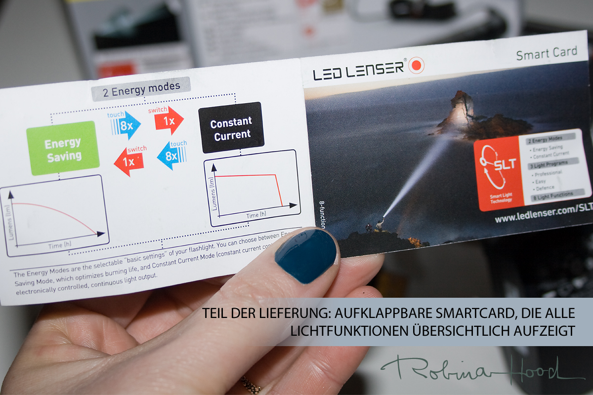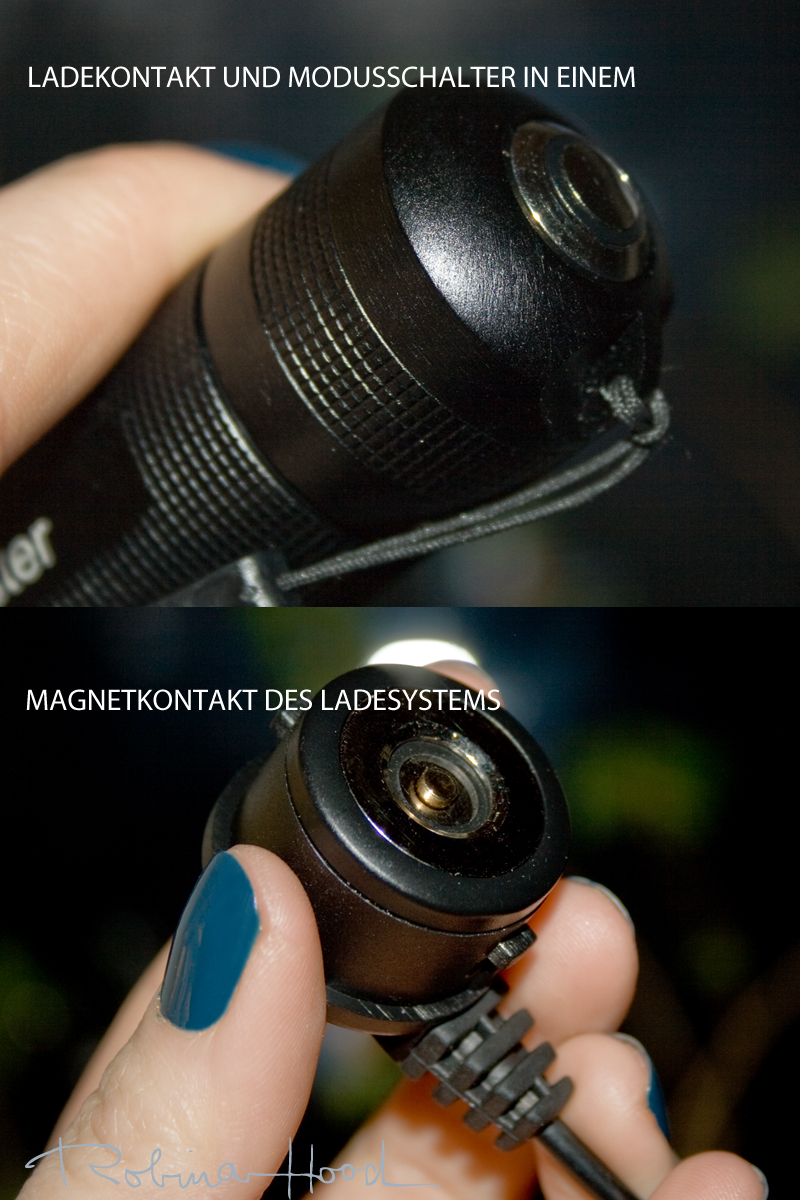 Ene knackige Anleitung findet man ebenfalls im Lieferumfang in Form der scheckkartengroßen Smartcard (eine Art Leitfaden mit knappen Worten und Piktogrammerklärungen). So hat man auch unterwegs einen schnellen Funktionsüberblick, sollte man mit der Lampe noch nicht vertraut sein. Mit nur einem Knopf werden alle Einstellungen ermöglicht. Dieser befindet sich am Ende des Schaftes und ist gleichzeitig der Ladekontakt der Lampe, der bei Aufladebedarf an das magnetische Ladesystem gedockt wird.