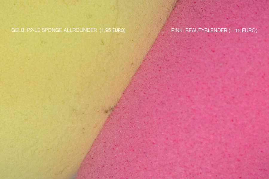 Hier erkennt ihr die Poren und Beschaffenheit der beiden Schwämme recht gut. Der p2-Schwamm ist zudem sehr durstig, was man aufgrund der engen Poren gar nicht vermuten würde. Ich dachte eher, dass er vielleicht gar nichts fressen würde. Ist aber nicht so. Ausgetrocknet wie eine Wüste. Dementsprechend hoch ist der Make-up-Verbrauch. Da rechnet sich so ein 1,95€-Schwämmchen auf Dauer auch nicht mehr. ; )
