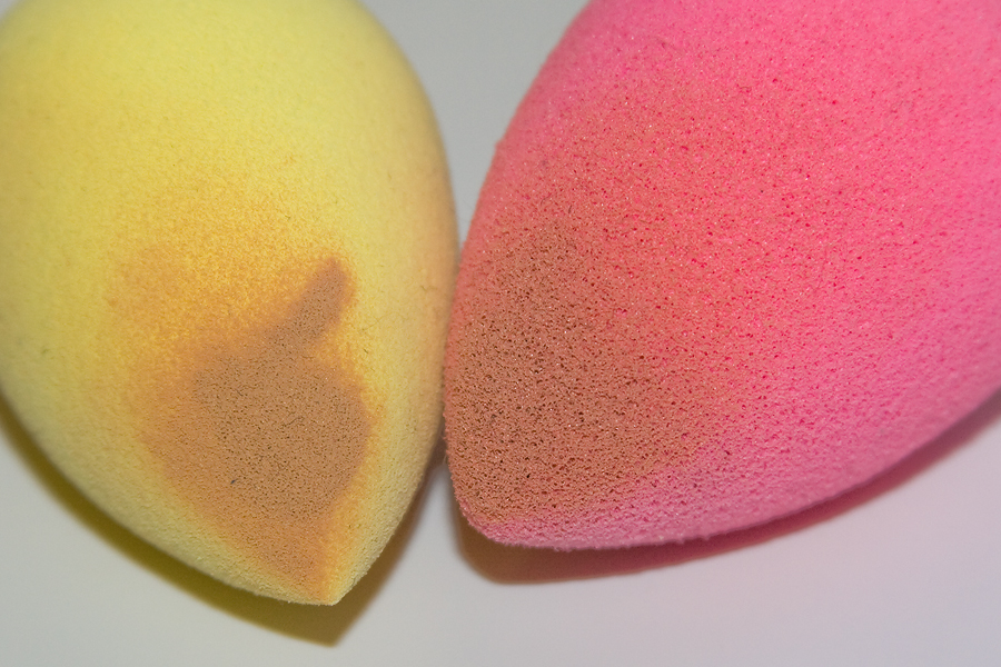 Hier kann man recht gut erkennen, dass der gelbe sponge allrounder von p2 das Make-up oberflächlich aufgesaugt hat, es aber auch nicht mehr abgeben wollte – ich hatte beide Schwämme auf der Haut verwendet und Make-up aufgetragen. Der pinke Beautyblender hat das Make-up zwar tiefer aufgenommen, es aber auch wieder gleichmäßig abgegeben. Das seht ihr auch an der flächigen und auslaufenden Ausbreitung des Make-ups.