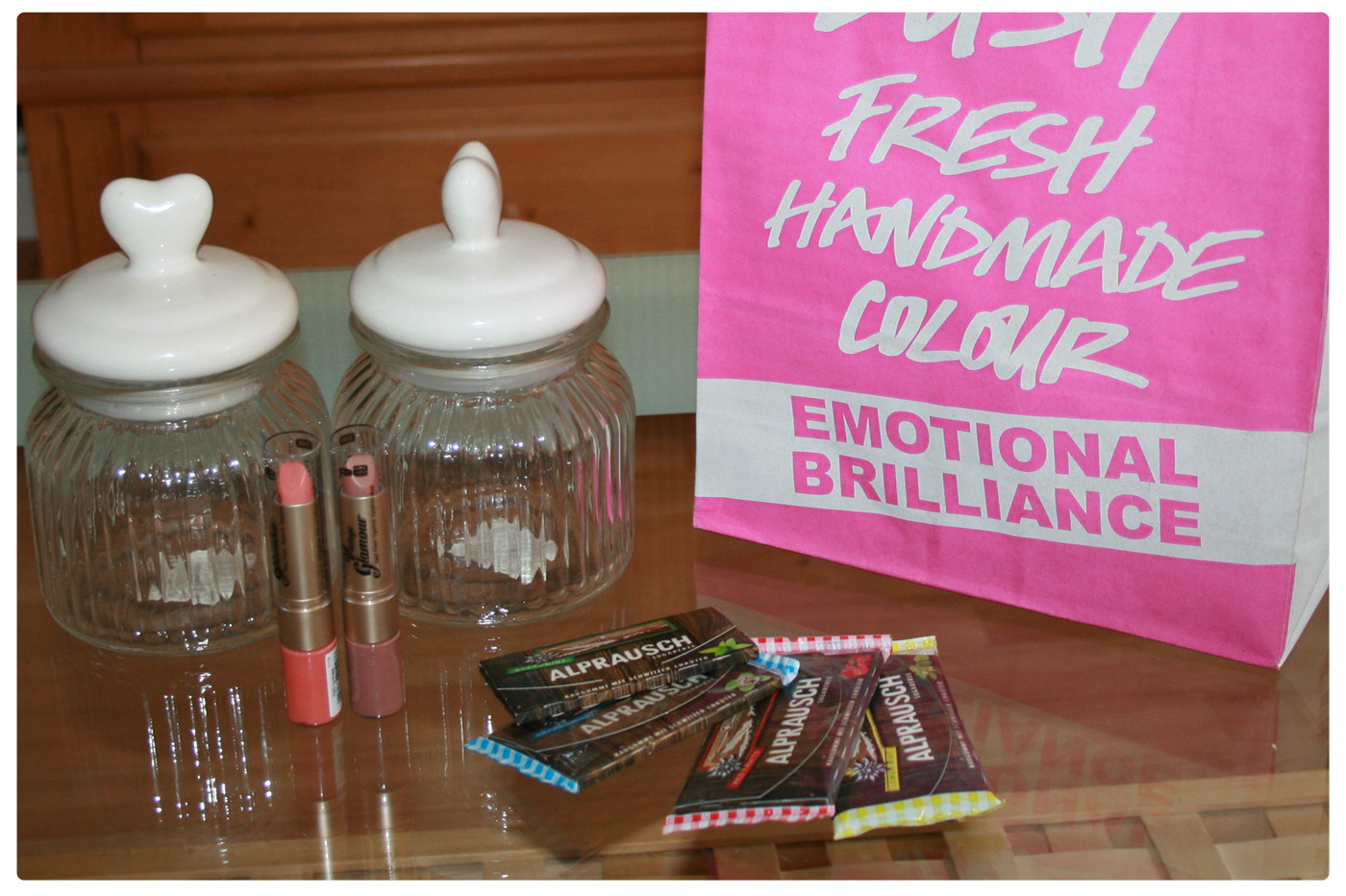 Von links nach rechts: Zuckerglasdosen (oder was auch immer man reinlegen will), Lippenstift und Lipgloss in einem (p2 „Vintage Glamour“-LE), ALPRAUSCH Kaugummis (voll lecker) — grün und blau habe ich bei Netto für je 0,69 € bekommen und gelbgrün und rot bei dm für 0,85 € — Der Preisunterschied verblüfft mich ein wenig. Na ja. Gut.