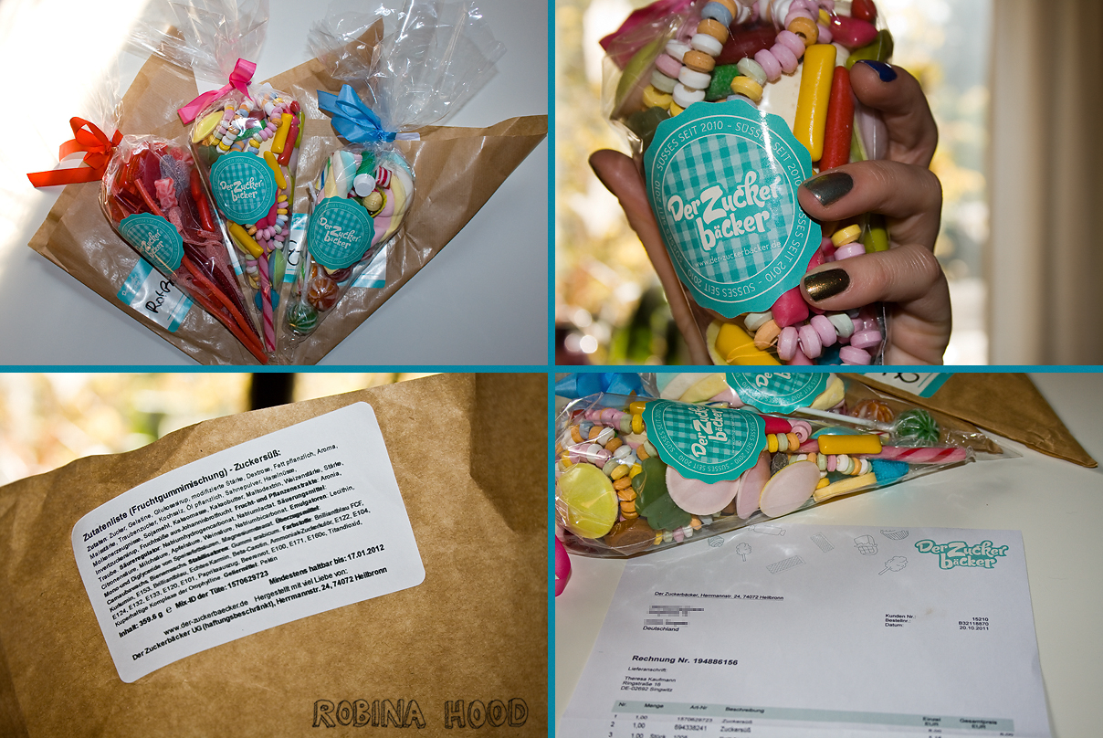 Ich steh zum Beispiel total auf saure Sachen und süße Candy-Leckereien (süße Ketten, süße Uhren, süße Lippenstifte). Deshalb habe ich mir einmal eine vorgemischte Tüte namens „Rothäppchen“ bestellt (wirklich sehr lecker!) und dann noch zwei Tüten mit Retroleckerkram und süßem Candy-Zuckerzeug selbst befüllt.