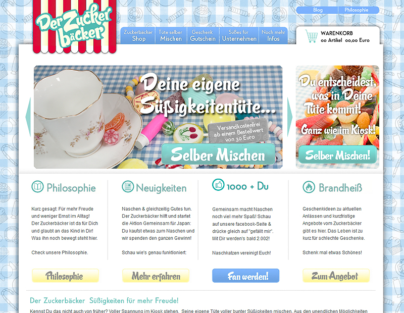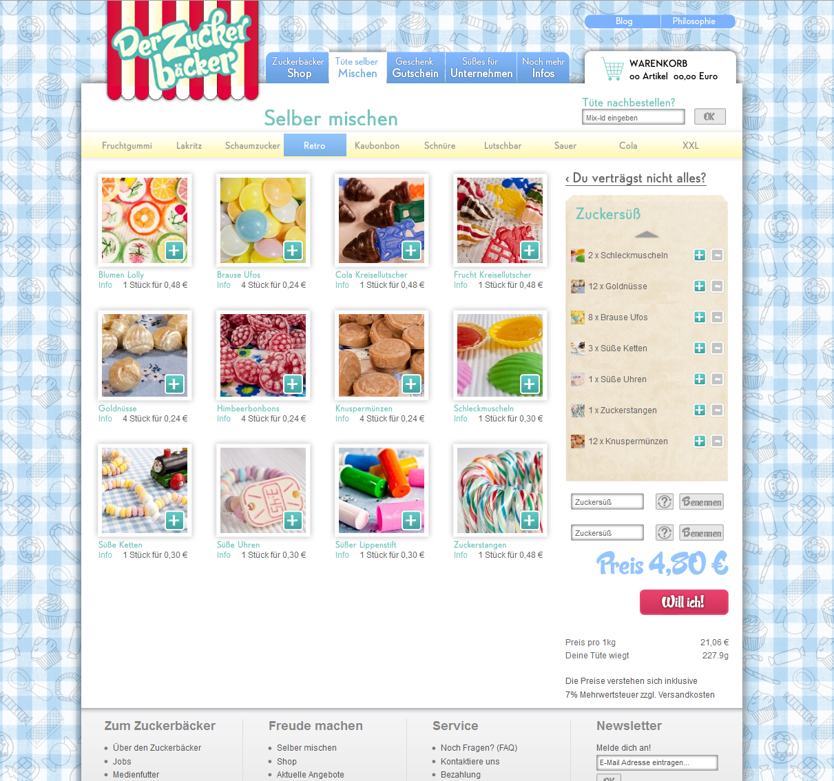 Man strolcht also durch die virtuellen Bonbonieren und kann aus bereits zusammengestellten Zuckertüten und mit Süßkram gefüllten Retro-Einweckgläsern wählen oder nach Lust und Gusto zur Tat schreiten und sich selbst seine perönliche „Zuckertüte“ befüllen.