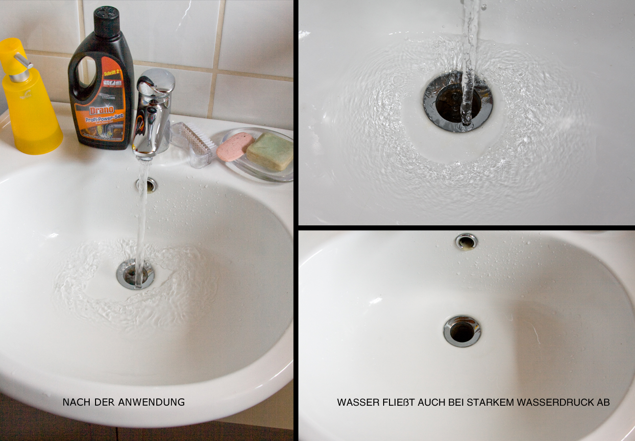 Ergebnis: Das Resultat des Drano Profi-Power-Sets ist sehr gut: rohrfrei! Das Wasser fließt sofort auf und das stehende Wasser ist komplett verschwunden.