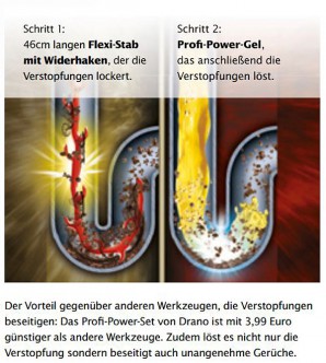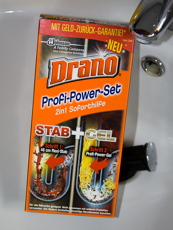 Das Drano-Profi-Power-Set verspricht Abhilfe in unter einer Stunde, das Gel reicht allerdings auch nur für eine einzige Anwendung. Der mitgelieferte Flexi-Stab dürfte für die Einmalanwendung des Gels aber deutlich entschädigen, da man ihn präventiv danach immer wieder benutzen und Haare und andere Sekrete aus dem Abfluss fischen kann. Diesen Flexi-Stab finde ich jetzt schon super.