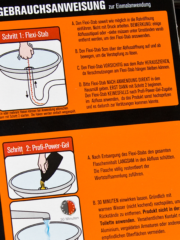 ACHTUNG! NIEMALS ERST DAS GEL UND DANACH DEN FLEXISTAB BENUTZEN! Sollte das Gel beim Stochern im Abfluss hochspritzen und auf die Haut gelangen, kann es zu Verätzungen kommen. Ebenfalls NIEMALS mit anderen Produkten verwenden, da es sonst zu chemischen Reaktionen und der Freisetzung von gefährlichen Gasen (Chlor) kommen kann. Auch für Kinder unzugänglich aufbewahren (Ein Sicherheitsverschluss ist zwar vorhanden, aber dennoch sollte man seine Kinder schützen und chemische Mittel etc. sicher verwahren).