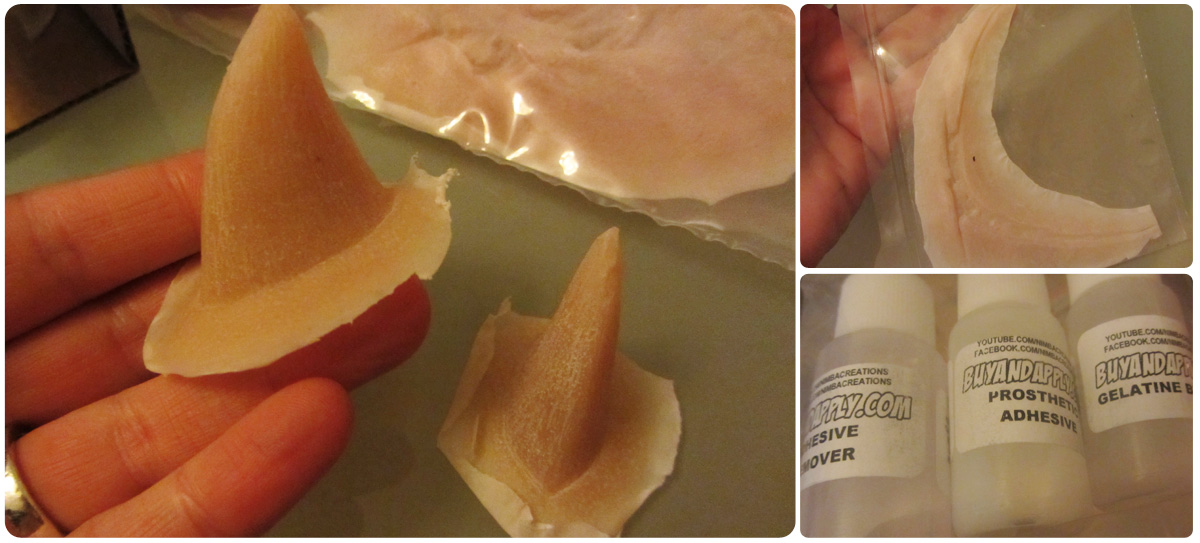 Hier seht ihr noch die Teufelshörner, die allerdings wohl eher für Personen mit einer hohen Stirn geeignet sind und wohl eher für Männer als für Frauen. Ich empfinde sie als störend groß. Werde ich also eher nicht benutzen, obwohl ich denke, dass mir Hörner gut stehen würden. *pfeif* Rechts in der Collage seht ihr noch eine „curved slash“-Wunde, also eine Messerwunde, die ihr auf dem äußeren Gesicht gut aufbringen könnt. Die drei Flaschen gehören zum Prosthetic Application Kit. Würde ich absolut empfehlen, das zu bestellen. Ihr werdet es brauchen.