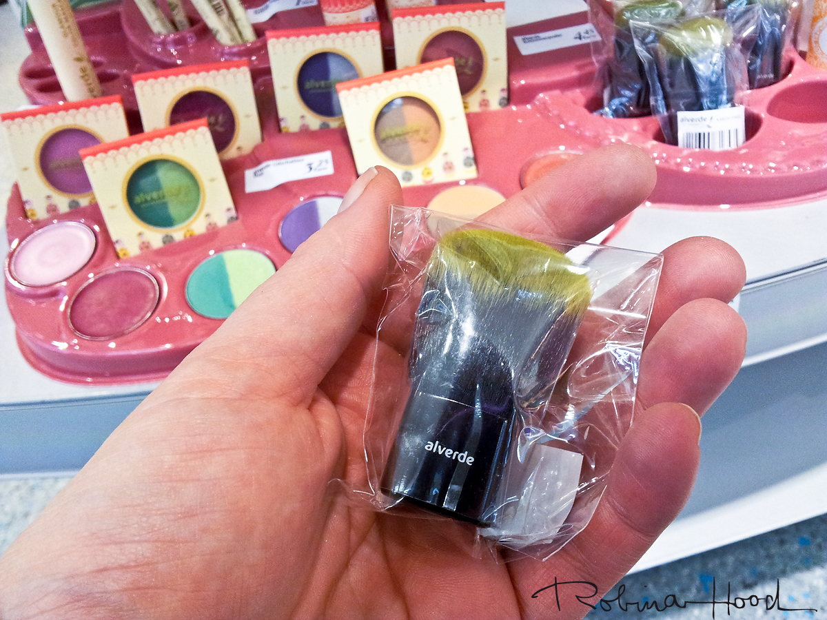 Als ich das Beutelchen dann allerdings öffnete, um mir die Produkte anzuschauen, war ich leicht verdutzt und irgendwie amüsiert: Das erste, was ich sah, war der Kabuki. Ich glaube, der wurde wohl frisch aus dem Brutkasten gehoben; ein seeeehr frühes Früchen, wie mir scheint. 4,45 € kommen mir leicht übertrieben vor für diese schwarz-grüne Pinsel-Baby: Winzig und flach. Weiß nicht, ob es seinen Preis wert ist und, ob andere Beauty-Kranke ihn loben werden. Wir werden es alle lesen und sehen. Für mich kein Kaufobjekt. Obwohl … wäre ich einer der Sieben Zwerge und schwul, würde ich mich vielleicht über ein derartiges Tupferchen für mein Zwergenpuder freuen. Meiner Meinung nach einfach nur unklar, wofür ich da fast 5 Euro zahlen soll.