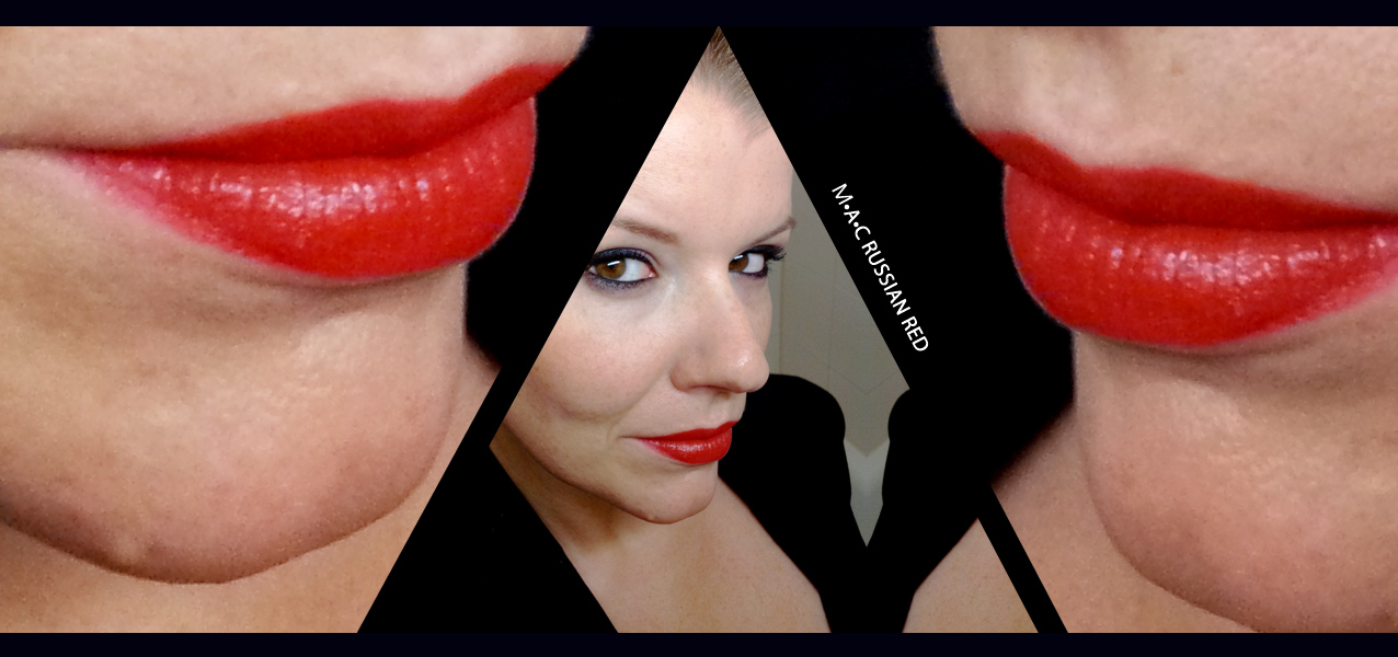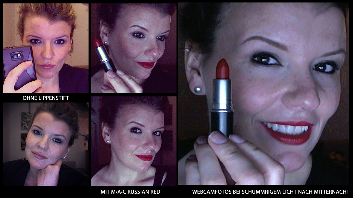 Nun aber zum eigentlichen Grund meines Schreibens. Ich stromerte kürzlich durch die Altmarktgalerie und blieb natürlich bei Douglas hängen. Dort gibt es ein schickes Separé von M•A•C (tödlich für den Geldbeutel) – schick ausgeleuchtet, gut sortiert und mit kompetenten MACtressen ausgerüstet, die einem gern bei der Suche nach dem „Ich schau nur mal“ behilflich sind. Letztlich wurde mir der Lippenstift in der Farbe „Russian Red“ aufgetragen, der eher kühler wirkt und die Zähne sehr weiß wirken lässt. Die Farbe trocknet matt und hält stundenlang, wenn man nicht gerade fettige Speisen zu sich nimmt. Ich hatte den Lippenstift nicht gleich gekauft, weil ich erst testen wollte, ob ich mich damit wohlfühle, wie lange die Farbe hält und, ob ich denn tatsächlich Rot tragen würde.