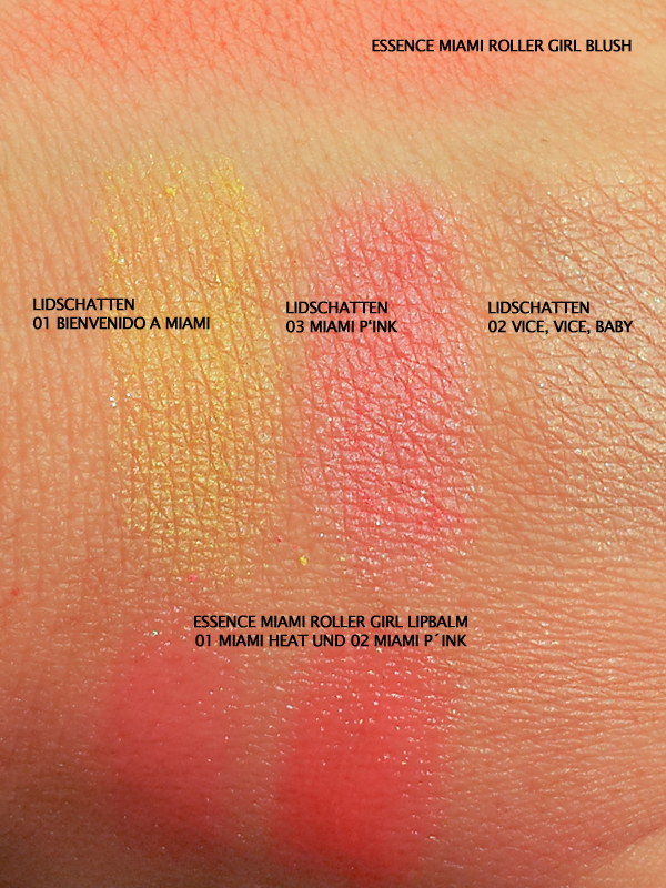 essence "miami roller girl"-LE - Handrücken-Swatches Blush, Lidschatten, Lipbalms