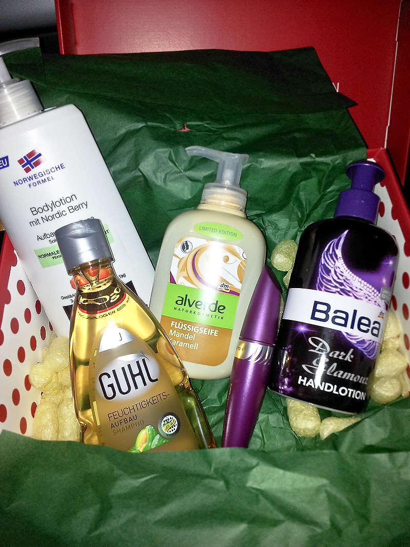 Inhalt dm Lieblinge-Box Dezember 2012: alverde, Balea, Neutrogena, Guhl, Max Factor