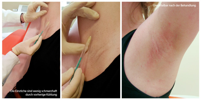 So sieht es aus, wenn das Botox injiziert wird. Man merkt kaum etwas, da die Achselhöhlen vor dem Spritzen gut gekühlt werden. Wichtig vor der Behandlung: Rasiert euch die Achseln für ein paar Tage nicht. So sieht der Doktor genau, wo die Haare sprießen und wo die Schweißdrüsen liegen.