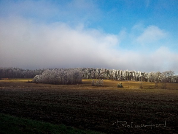 Die Landschaft sah regelrecht surreal aus: brauner Acker und vergilbte Wiesen vor schneebestäubten grünen Tannen; dazu die Sonne, die noch kräftig durch die Schneewolken stieß und auf dem Boden auftraf — Das Handyfoto schoss ich mit offenem Mund, kältegefluteter Lunge und aufgerissenen Augen. Ich möchte es auch gerne mit euch teilen und hoffe, ihr findet Gefallen daran.