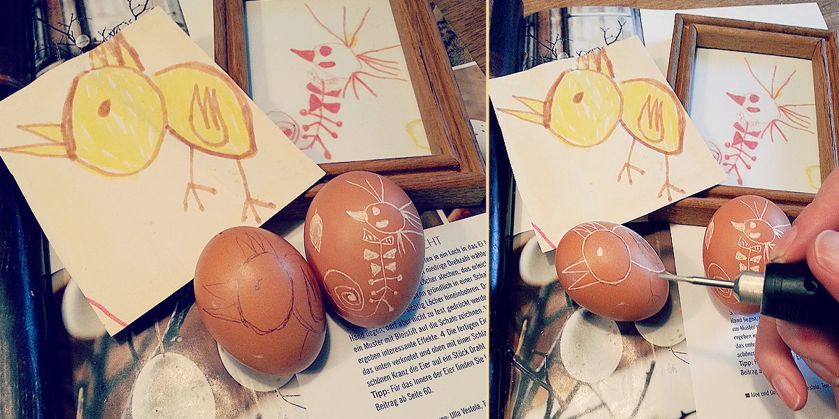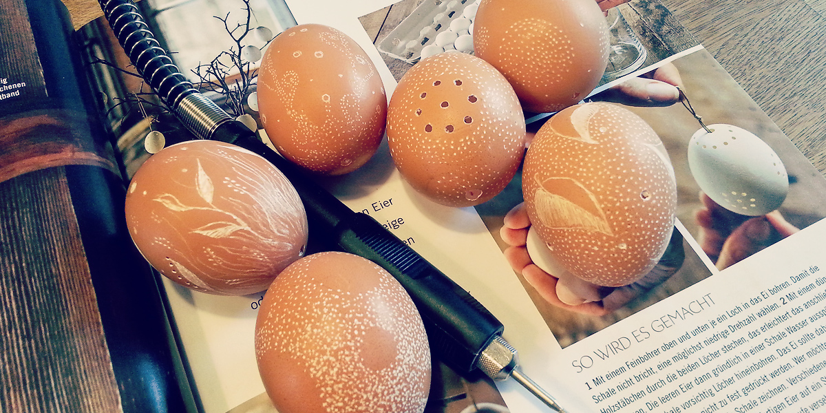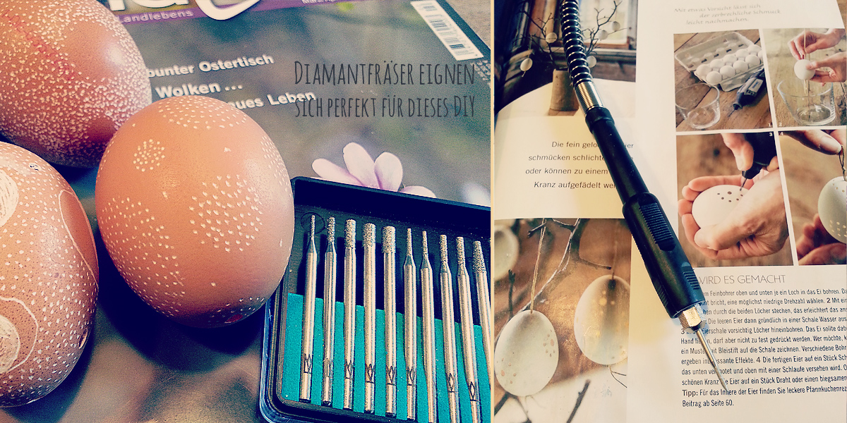 Ich habe die Artikelvorlage der Landlust, in der ausschließlich Muster gebohrt wurden, ein wenig abgewandelt und die Muster mit einem Diamantfräser in die Eierschalen „gekratzt“statt diese ganz und ausschließlich zu durchstoßen.