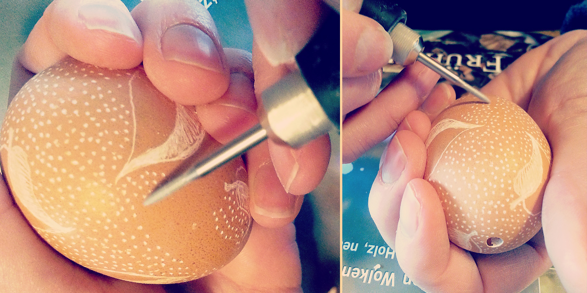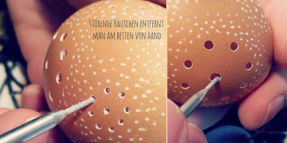 Beim Löcherbohren werdet ihr übrigens bemerken, dass mitunter kleine Häutchen aus dem Inneren der Eierschale die Muster „verstopfen“. Diese sollten gereinigt werden. Das geht händisch am allerbesten. Ihr nehmt euch einen kleinen Fräser, den ihr ohne Maschine in den Fingen haltet, durch die Löcher führt und dann die Häutchen einfach entlang der Bohrungen wegefeilt. So werden die Muster schön sichtbar und die Bohrungen frei.