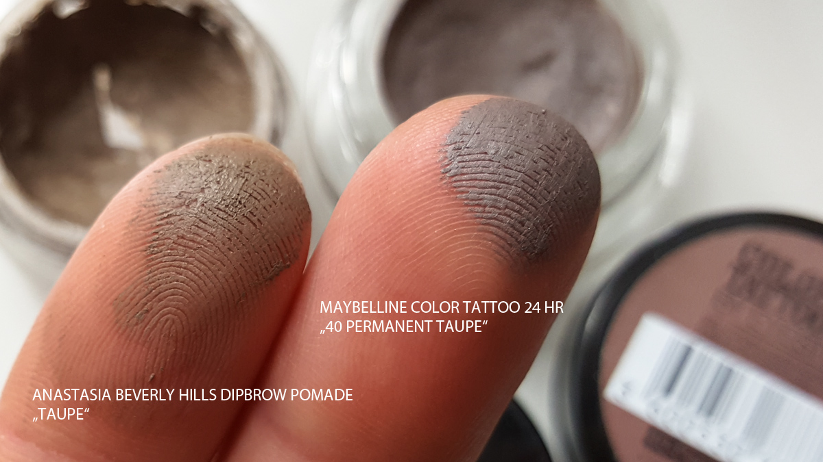 Oftmals wird der Color Tattoo 24 h Lidschatten genannt, wenn es um die Beschaffung einer günstigeren Alternative geht. Meiner Meinung nach wirklich kein Dupe, aber dafür eben eine sehr brauchbare Alternative. Die Farbe des Color Tattoos ist kühler und gräulicher. Haltbarer ist sie auch. Und zwar eindeutig. Merkt man besonders beim Abschminken. Textur und Auftrag ähnlich. Beide sehr leicht und kontrolliert zu verarbeiten.