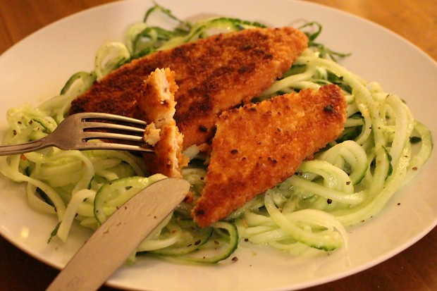 Hier seht ihr die Schnitzel von Garden Gourmet auf Gurken-Spaghetti, die ich mit Salz und Pfeffer abgeschmeckt hatte. Sehr fix gemacht (Kein Gericht von Garden Gourmet braucht länger als 10 Minuten), frisch, saftig und kross-lecker: