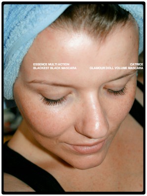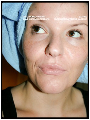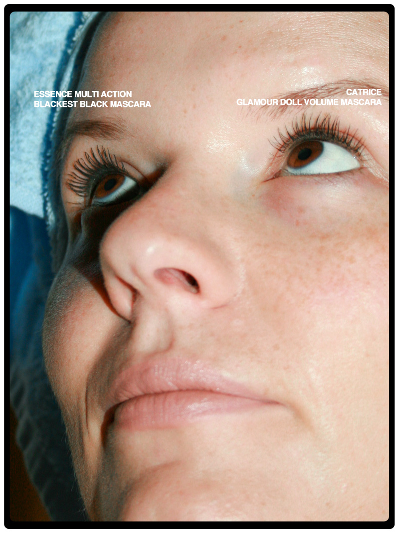 Aloha Mitmenschen! Eigentlich ist das kein wirkliches Wimperntuschenbattle, da der Sieger für mich von vornherein feststeht, aber dennoch wollte ich einen kleinen optischen Vergleich bringen. Warum? Vor kurzem erzählte ich euch auf meiner Fatzebuck-Seite (hier klicken), dass ich die „blackest black“-Mascara von essence doch recht nice finde und ihr auch eher als der „CATRICE Doll Eyes Volume Mascara“ einen Puppenaugeneffekt zutraue. Finde ich auch noch immer und genau deshalb habe ich nach dem Duschen ein paar Fotos geschossen und auch wieder mit der CATRICE Doll Eyes Volume Mascara verglichen.
