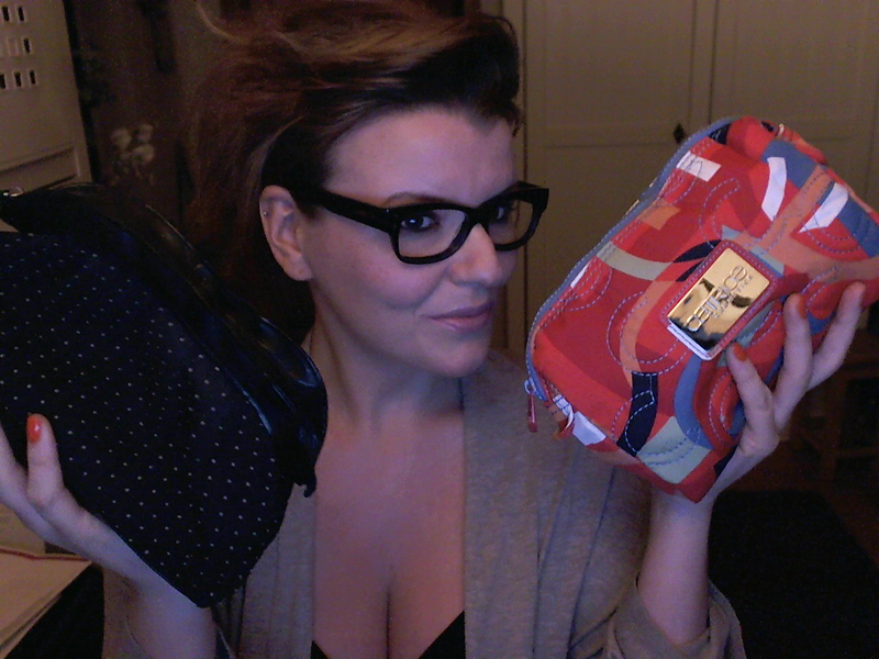 Ach, ich zeig‘ sie euch mal schnell. Von euch aus links meine alte Kosmetiktasche und rechts die aus der „Cruise Couture“-LE von CATRICE (Webcamfoto):