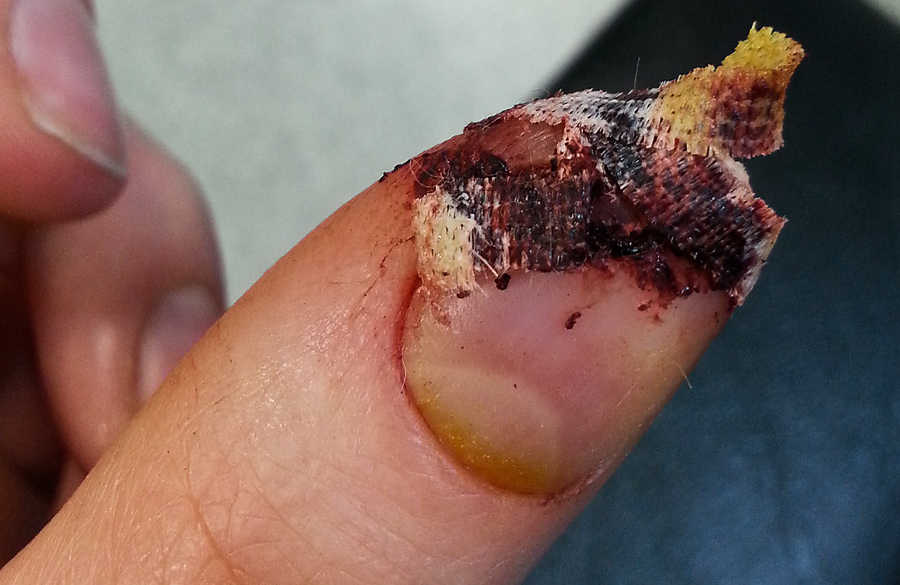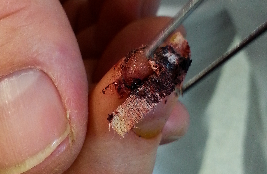 Von den Pflasterstreifen befreit, sah mein Daumen so aus: