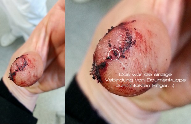 Hier die Unterseite des Daumens. Ich habe euch mal markiert, wo meine Kuppe noch mit dem Rest des Daumens verbunden war.