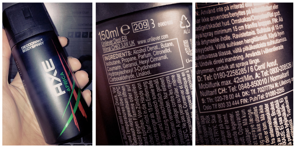Das Deo ist übrigens aluminiumfrei. Hier mal die Liste der Inhaltsstoffe und auch gleich die Nummer der Service-Hotline, falls ihr die Mitarbeiter löchern wollt, wieso der Markt plötzlich wieder geentert wird und warum Axe Africa so lange verschwunden war.