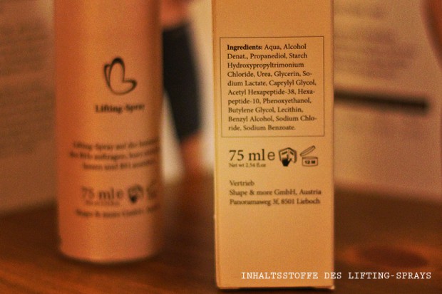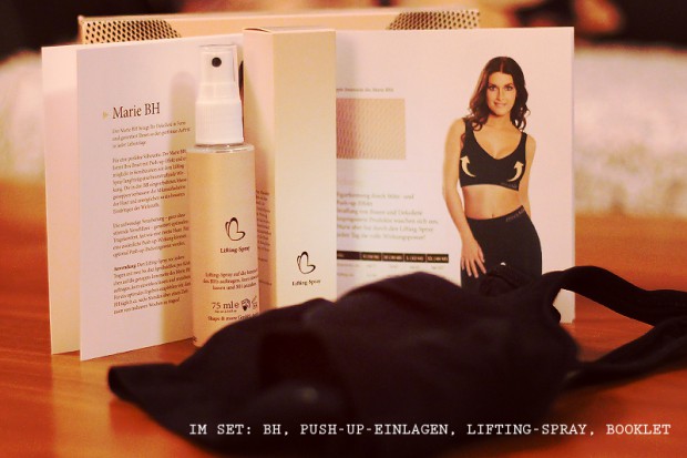 Und das ist drin: Marie BH, Einlagen, um die Brüste noch mehr zu pushen, ein kleines Booklet mit Infos zum gekauften Produkt und den weiteren erhältlichen Produkten. Das Wichtigste: Das Lifting Spray. Enthalten sind 75 ml. Und das ist drin: