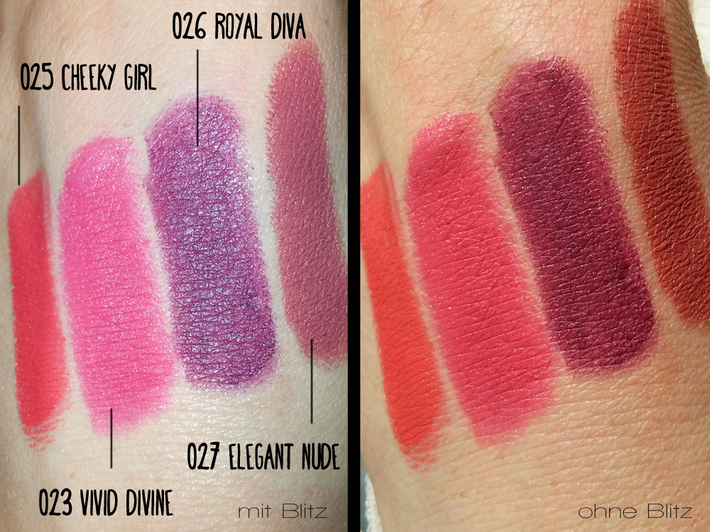 Vier Nuancen gibt es insgesamt: 025 Cheeky Girl, 023 Vivid Divine, 026 Royal Diva, 027 Elegant Nude