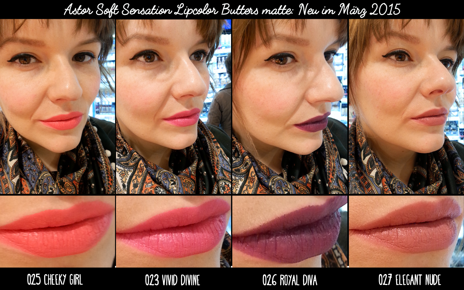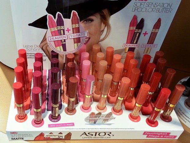 Leute, ich will hier ja nicht unnötig jemanden anfixen, aber ich kann nicht anders! Habe heute die neuen ASTOR Soft Sensation Lipcolor Butters gesehen, die es nun auch mit mattem Finish gibt. Der glossige „Pretty in Fuchsia“ ist bereits einer einer Lieblinge (für Lippen und Wangen) und schon tüchtig benutzt. Trocknet nicht aus und lässt sich prima schichten.