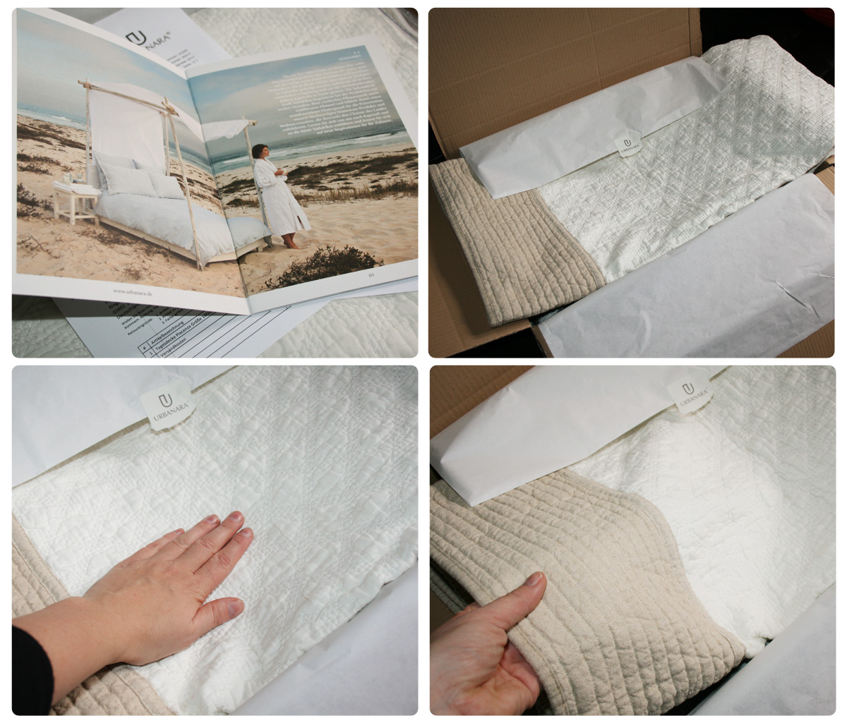 Kurz etwas zum Bestellvorgang: Die Seite ist sehr übersichtlich in fünf Shopping-Kategorien unterteilt (Schlafen, Wohnen, Baden, Essen, Sale) und beinhaltet weitere Unterkategorien. Alles sehr schön aufgemacht. Die Produktfotos sind wunderbar und meine bestellte Decke entspricht genau der Beschreibung – keine Beschönigung nötig, da wirklich mindestens genauso schön wie in der Artikelbeschreibung. ;) Was die Lieferzeiten angeht, so sollte man unbedingt in die Beschreibung und/oder final in den Warenkorb schauen. Es kann durchaus zwei bis drei Wochen dauern, bis man seine URBANARA-Schätze in den Händen hält. Per Mail wird man über den Fortschritt der Bestellung informiert (Bestellung erhalten, Geld erhalten, Ware verschickt) und hat so die zeitliche Kontrolle über den Warenweg.