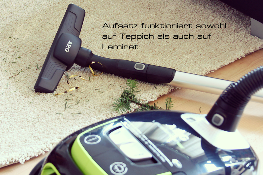 Der große Aufsatz kommt sowohl auf kurzfaseriger Auslegware zum Einsatz als auch auf zotteligen Teppichen. Dazu muss man nur die Hebelstellung verändern (rechts im Bild) und schon kann es losgehen. Die Bedienungsanleitung zeigt alles recht schön in einer mit Bildern illustrierten tabellarischen Übersicht. Ihr werdet also bestens von AEG über alle Düsen und Anwendungsgebiete informiert.