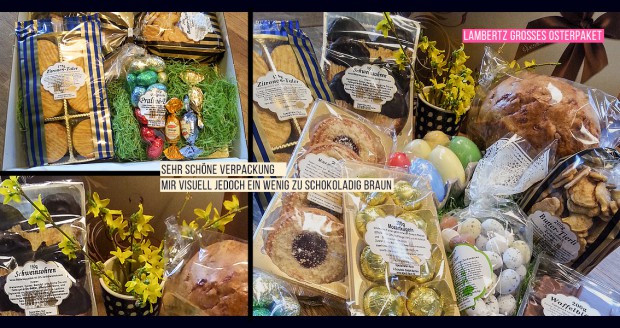 Die Auswahl ist vielfältig – vom Törtchen über Schokoladenpralinés bis hin zu zitronigen dünnen Talern ist alles dabei, was die Ostertafel perfekt macht. Die beigegebenen Eier-Kerzen samt Ostergras zaubern im Nu einen Last-Minute-Deko. Finde ich super. Ich kann nichts finden, was mich daran hindern würde, das Paket weiterzuempfehlen. Und jetzt viel Spaß beim Stöbern. :)