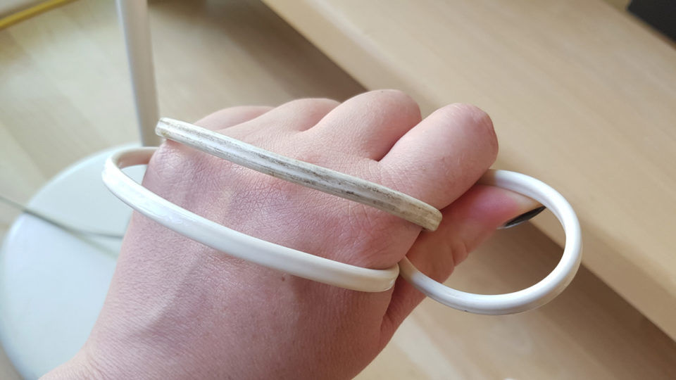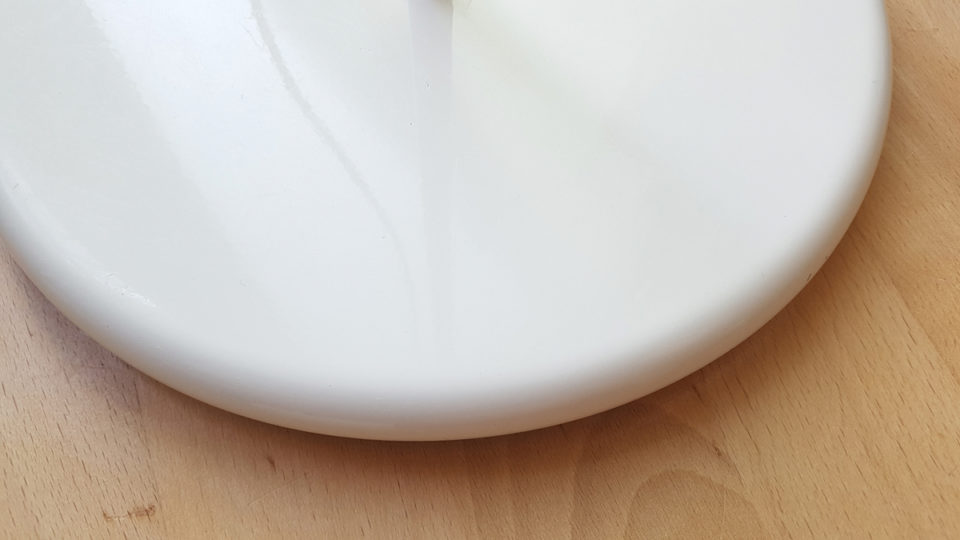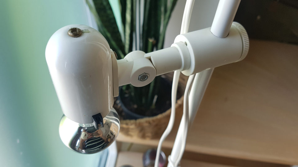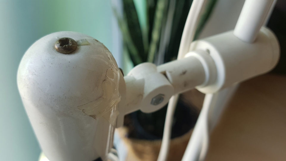 Das ist der Fuß meiner allerliebsten Flohmarkt-Errungenschaft, einer weißen Lampe mit zwei schwenkbaren Lampenfassungen. So wie ihr sie hier seht, habe ich sie vom Flohmarkt in mein Heim mitgenommen.