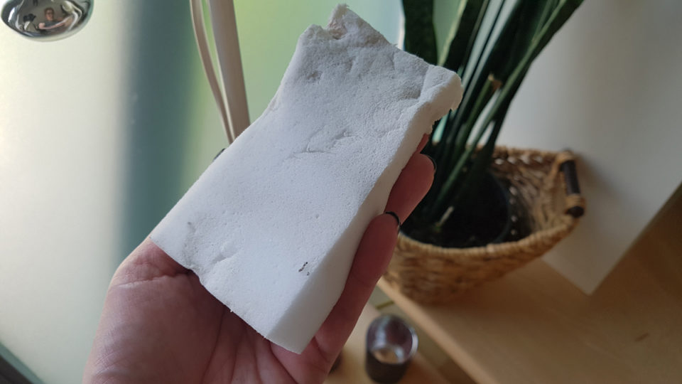 So sieht der Schmutzradierer nach der halben Arbeit aus. Nicht vergessen, dass er sich aufbraucht und nicht ewig verwendet werden kann. Ich habe schon bei einigen Amazon-Rezensionen lesen müssen, dass sich Käufer aufregen, dass der Schwamm zerfällt, krümelt oder sich verformt. Das ist nun mal so und wird sich auch in 1000 Jahren nicht ändern. Der Schwamm arbeitet abrasiv und nutzt sich dabei selbst ab.