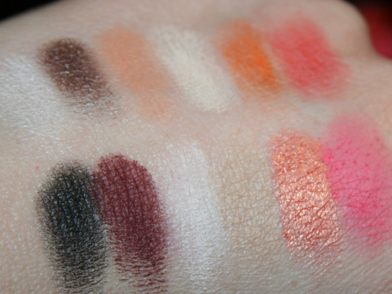 Wirklich eine interessante Palette, die Nudetöne mit knalligen Farben mischt. Die Orange- und Rottöne lassen sich prima als Rouge missbrauchen, aber natürlich auch als Lidschatten verwenden. Der Burgunder-Ton „VANDELLAS“ ist regelrecht gediegen aufregend. Ich mochte ihn sofort. Auffällig ist auch, dass es drei doch ähnliche Weiß-Creme-Nude-Töne gibt = sehr gut als Blendwerk geeignet. ;)