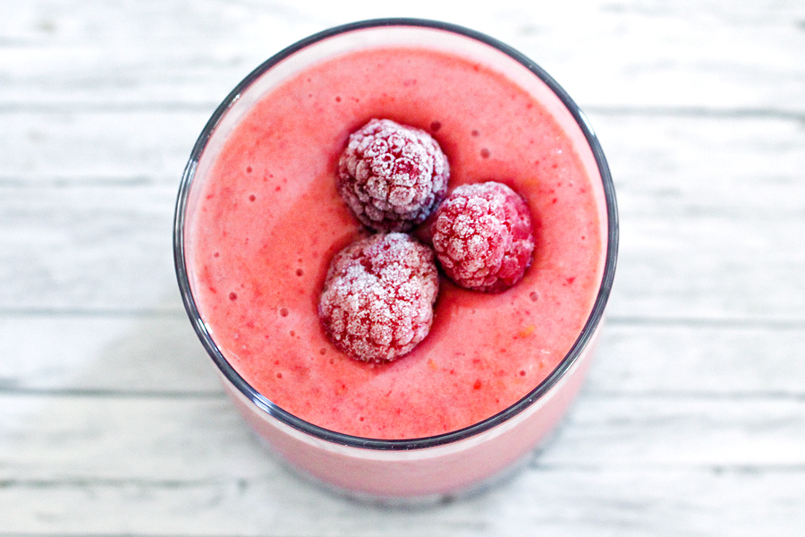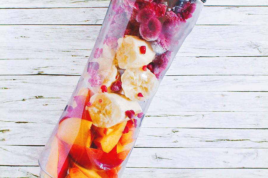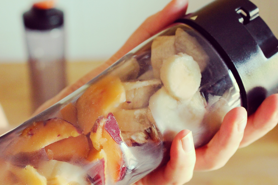 Hier ein Shake mit Nektarinen, Banane und Möhren. Ich habe zusätzlich wieder TK-Himbeeren und ein bisschen Milch hinzugefügt, weil ich einen kalten Shake wollte. Generell könnt ihr die Früchte im Kühlschrank lagern vor dem Mixen. Dann ist der Smoothie schön kühl und frisch. Andernfalls könnt ihr das Behältnis auch direkt nach dem Mixen mit dem beigelegten Trinkaufsatz (gigantisch toll für unterwegs) verschließen und im Kühlschrank aufbewahren, bis der Smoothie die Temperatur erreicht hat, die ihr mögt.