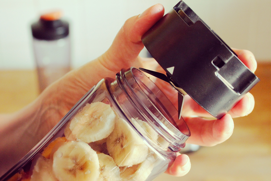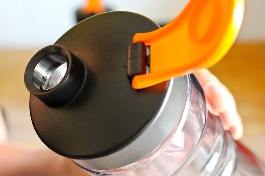 Wenn ihr den fertigen Smoothie gleich aus dem Becher trinken wollt, tauscht einfach den Mixaufsatz mit dem Trinkaufsatz. Der orange Bügel-Verschluss hält sehr sicher und die Öffnung ist, meiner Meinung nach, sehr angenehm beim Trinken.